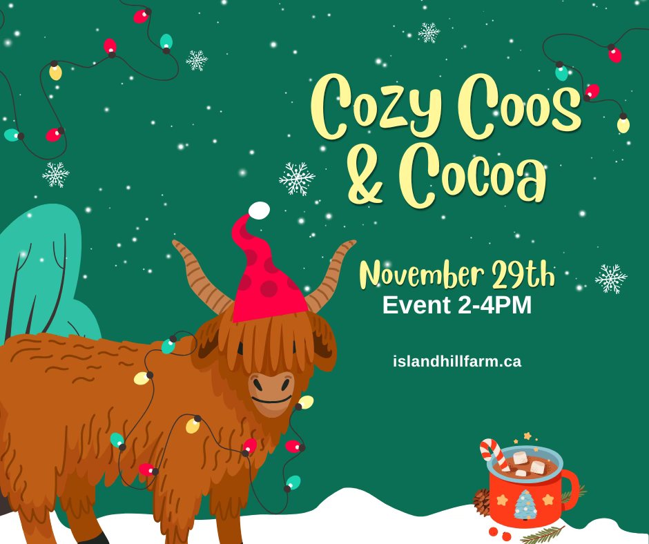 Join us for a warm and whimsical afternoon at Island Hill Farm as we host our Cozy Coos & Cocoa event — a special one-time experience before the holiday season begins! Enjoy an up close visit with our beloved Highland cows, enjoy a group visit to their pasture, and soak up all the fluffy, friendly coo magic. Afterward, head into our Dairy Barn to warm up with a comforting cup of hot cocoa. We’ll also have a selection of delicious baked goods available for purchase. While you’re here, don’t forget to browse our Shoppe for Highland Cow–themed gifts and goodies — perfect for holiday giving or treating yourself. This event is offered at a discounted rate as a special seasonal treat. Don’t miss your chance to enjoy our beautiful coos in this cozy, heartwarming setting! We can’t wait to welcome you!